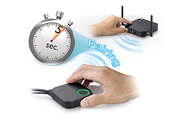 Ebenso einfach ist es, den Sendebutton von InstaShow™ mit einem Empfänger zu verbinden. Zum automatischen kabellosen Pairing den Pairing Key 5 Sekunden lang drücken und Empfänger und Sender zueinander richten. Der Empfänger kann zudem über einen Webzugang in den Pairing-Modus gesetzt werden, wenn er zum Beispiel an einen an der Decke installierten Projektor montiert oder aus anderen Gründen schwer zugänglich ist.