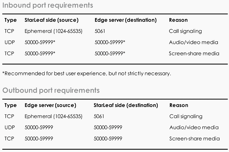 Stellen Sie für jede StarLeaf-Domain, die Sie anrufen möchten, sicher, dass Ihre Firewall den Datenverkehr von und zu der Domäne example.call.sl auf folgenden Ports gemäß der Tabellen zu läßt. Das setzt ein zur Verfügung stellen der angegebenen Ports voraus TCP/UDP 50,000-59,999. Wenn Ihre Firewall IP-Adressen und nicht DNS-Namen erfordert, wenden Sie sich an den StarLeaf Support bezüglich der benötigten IP-Adressen.